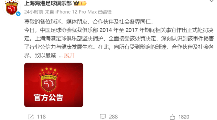 被扣5分+罚款!处罚结果出来后,中超卫冕冠军上海海港足球俱乐部第一时间在官微上发布公告(下图)。文中表示俱乐部在初创阶段的管理环节上存在失当、失控,对行业规则敬畏不足等问题,并许诺以后会深刻地以此为戒。俱乐部的致歉引起大量海港球迷的共鸣,大家纷纷在评论区留言表达了理解和支持,表示我们清清白白,四个中超冠军干干净净。