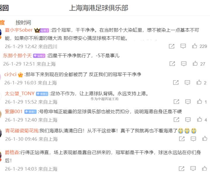 这些海港球迷到底说了啥?其中点赞最多的一个留言写道:四个冠军,干干净净,如果你无所谓的随大流 那你想安心搞足球根本不可能(下图)。除了这个留言,不少留言都表达了类似的观点,认为海港队清清白白,四星干干净净。还有人认为,只要四星干干净净就行,扣5分不是事。更有人批足协不作为,让海港背g。